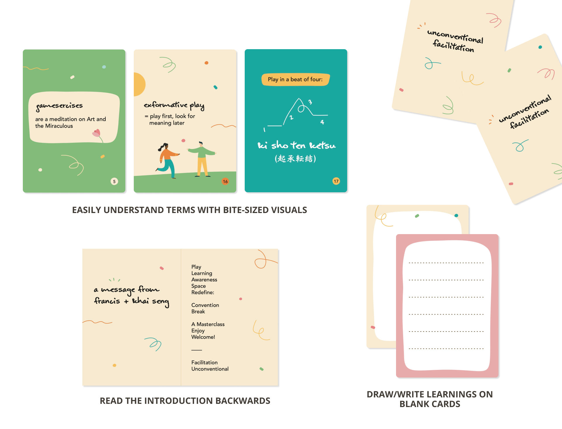 The opposite of it would be: colourful visuals in non-standard sizes to suggest an informal learning setting without a lecturer. We decided to use pocket-sized cards to stay true to the nature of the sessions — interactive play.