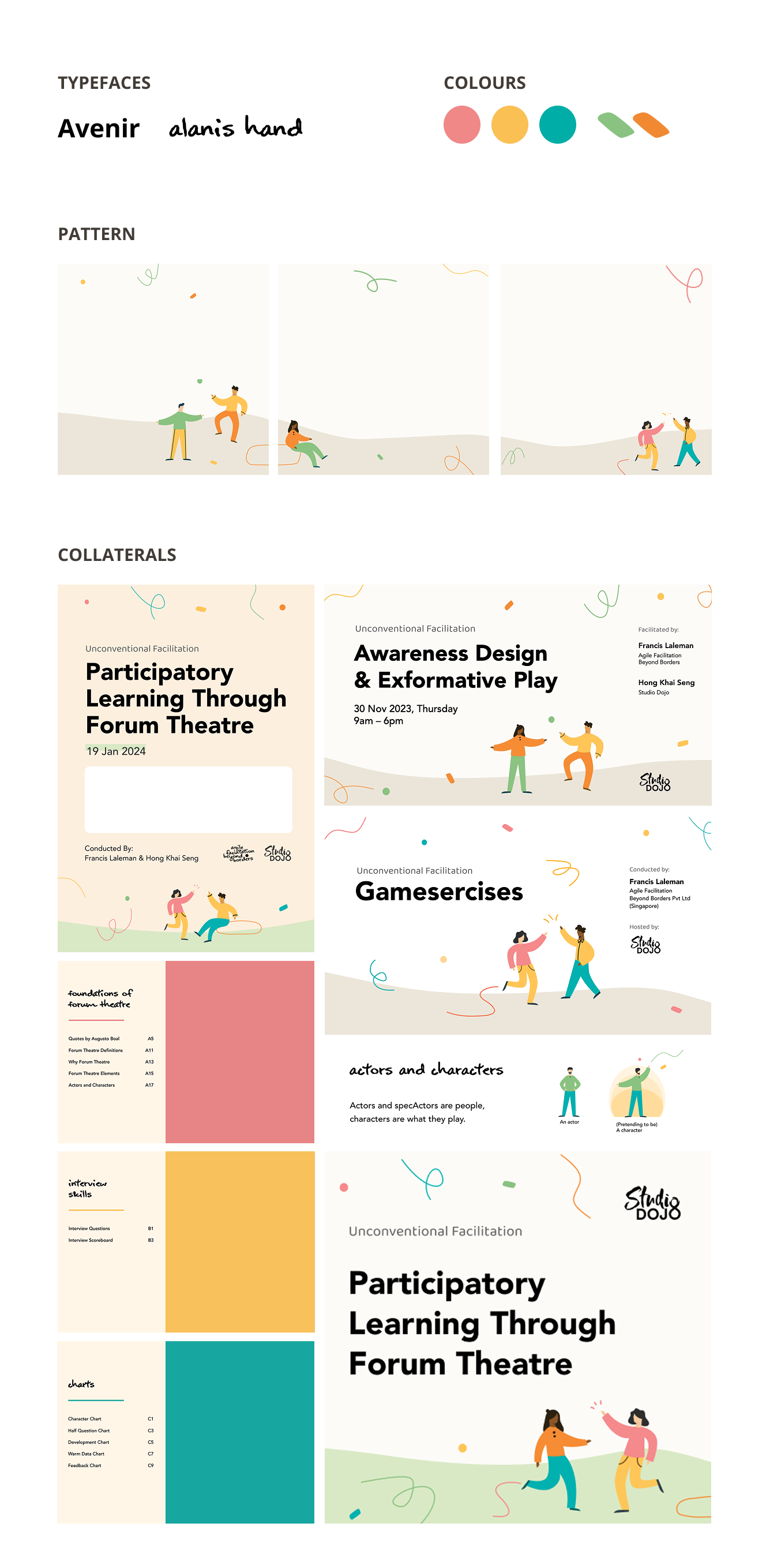 As the sessions centred on returning to the fundamentals of play, I referenced the three primary colours (red, yellow, blue). To introduce a sense of warmth and approachability, I replaced red with pink to soften the palette while maintaining vibrancy. Secondary colours (orange and green) were introduced to expand the system and create flexibility across materials.