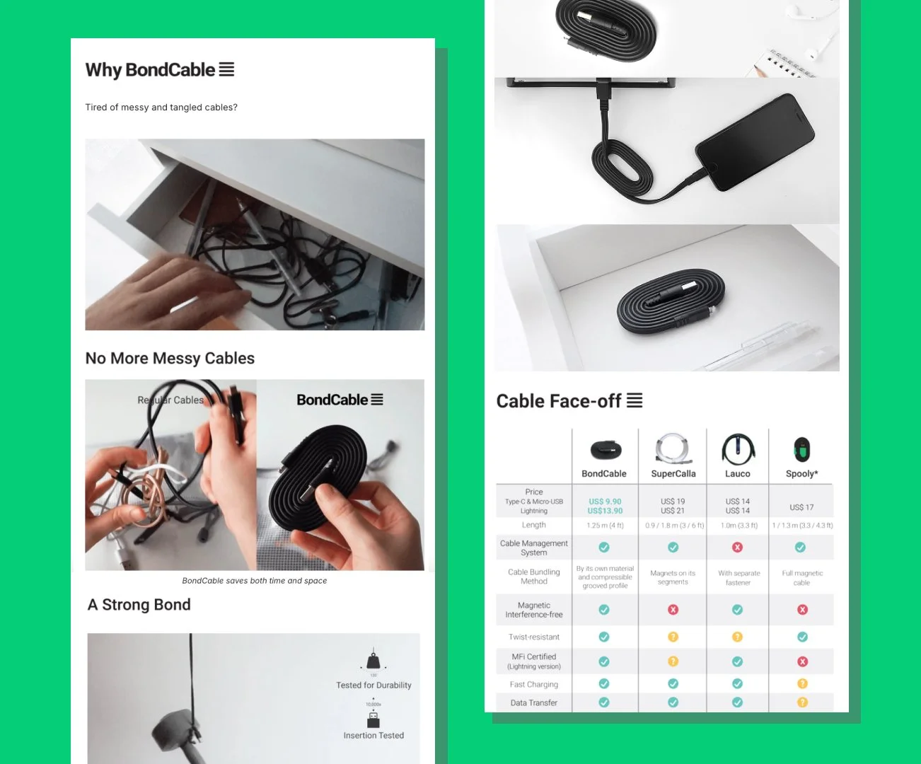 We aimed for relatability and clarity by showing how BondCable eradicates the frustration of tangled wires in a neat, compact way.